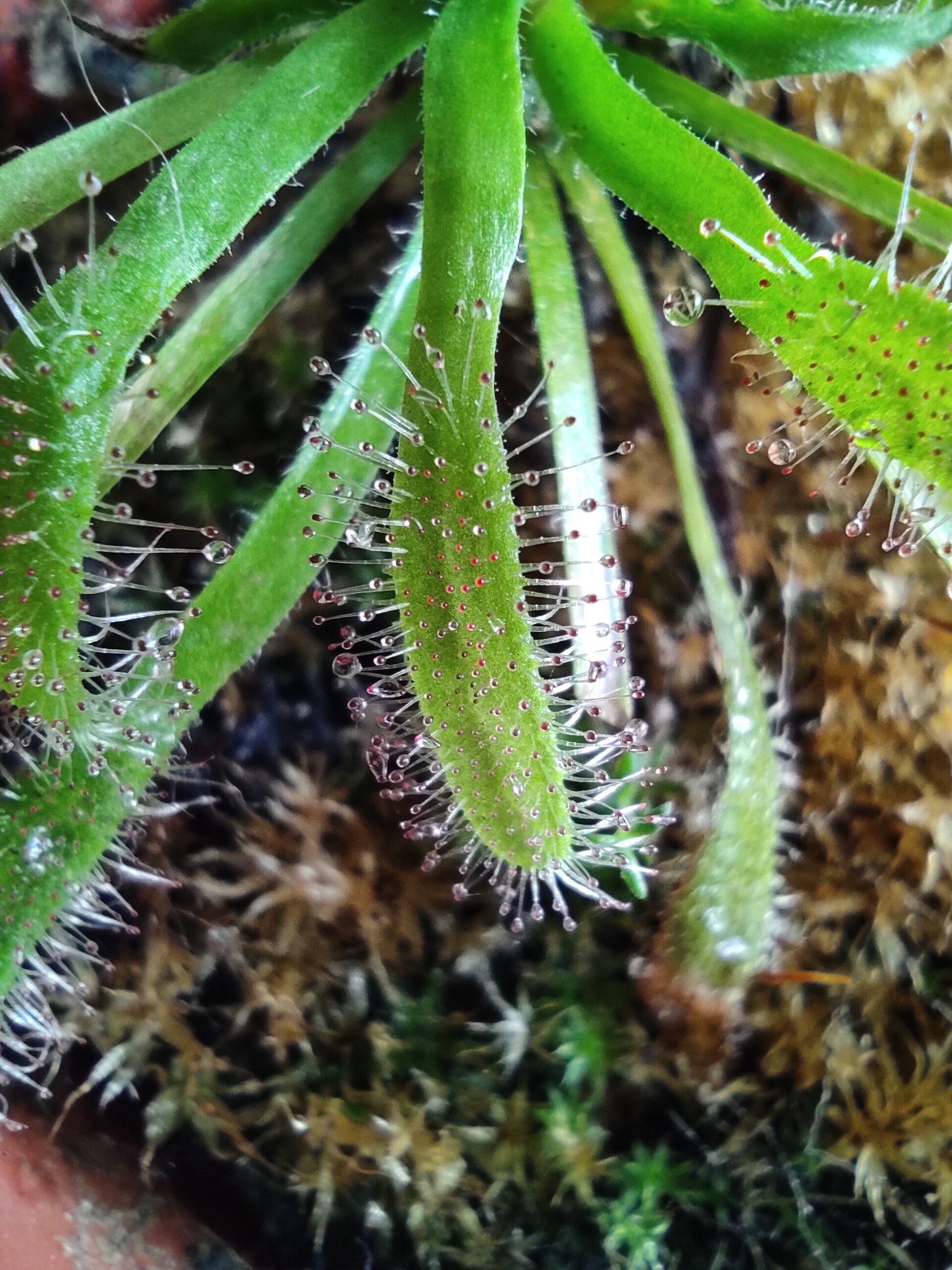Especie de drósera resistente y de fácil cultivo. Sus hojas están recubiertas de pelos pegajosos dónde se pegan los insectos, para luego ser digeridos por los enzimas segregados por la hoja. El aspecto de estos pelos es fascinante en visión macro (ver foto).