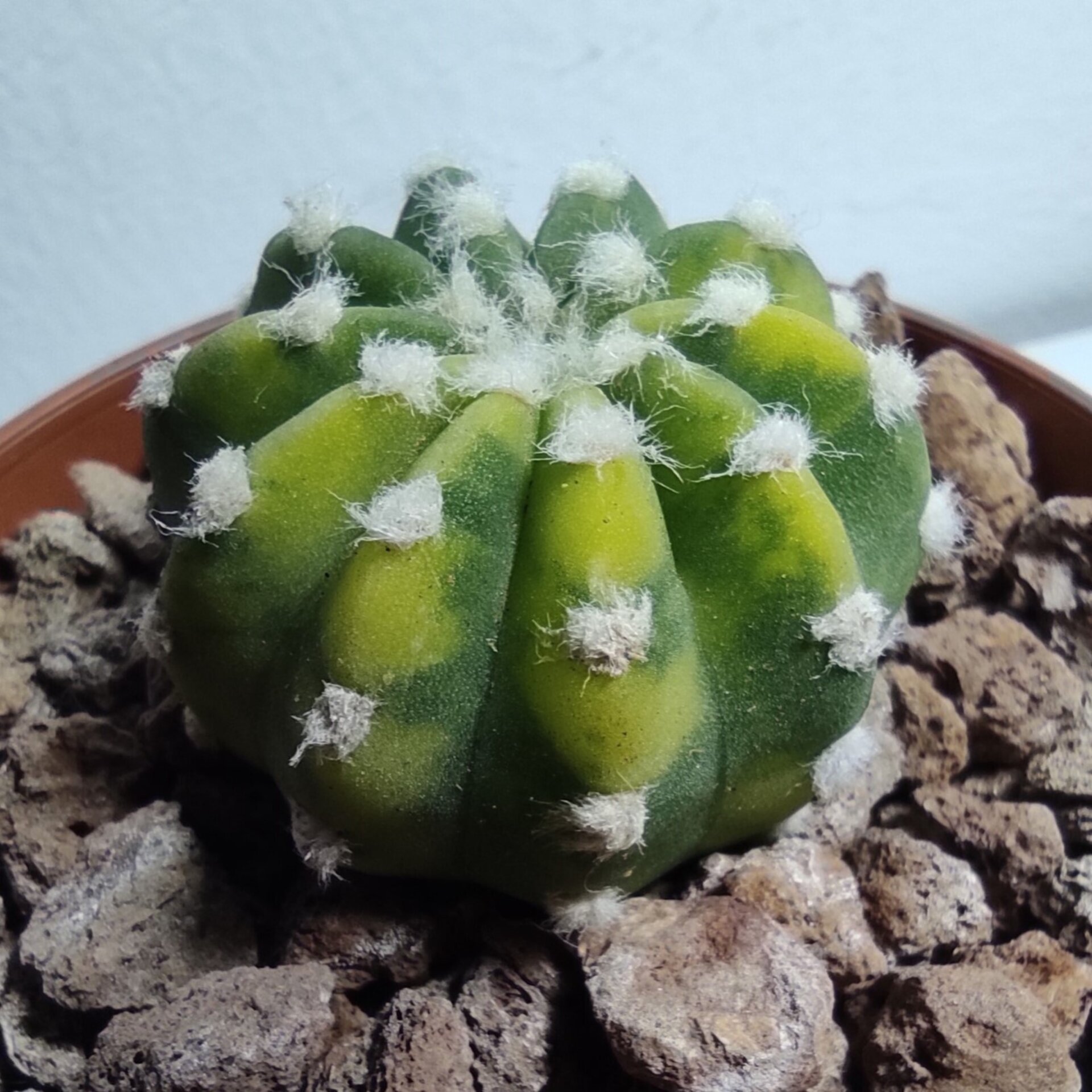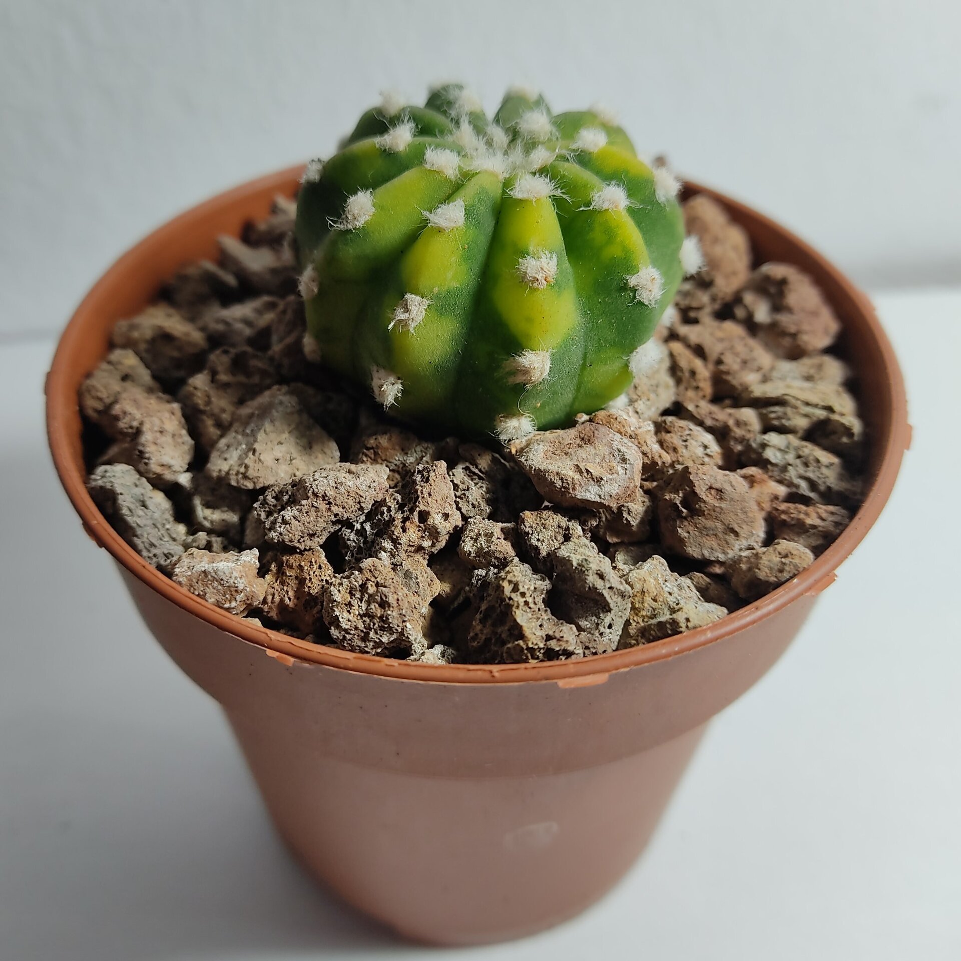 Cactus globular con espinas cortas y costillas bien marcadas, nativo de Bolivia y Paraguay. Es de color general verde oscuro, pero la apreciada forma 'Variegata' que ofrecemos presenta áreas de color amarillo claro que la hacen muy peculiar.